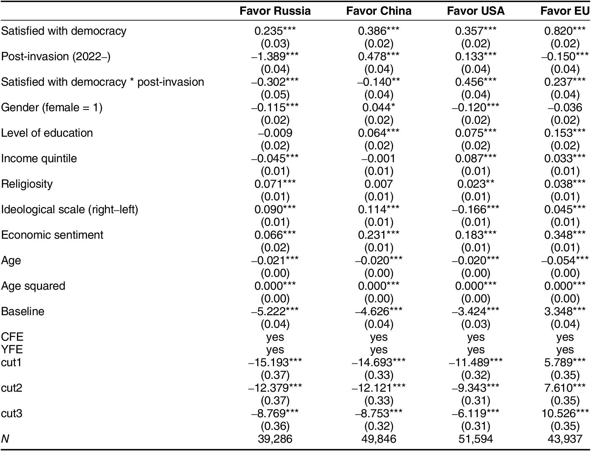 As the dependent variable, we included each of the four favorability ratings for China, Russia, the United States and the European Union. Our main independent variable of interest included respondent satisfaction with democracy, together with a dummy variable for whether the survey took place after the February 2022 invasion of Ukraine (either in the 2022 or 2023 waves) and its interaction with democratic satisfaction. Control variables included four types of variables. First, we included common sociodemographic indicators such as age (both as a linear and square term to detect the potential nonlinearity of age effects), gender (proportion female), income, and education. Second, we included attitudinal controls such as religiosity (importance of religion), ideology (right- to left-wing self-placement), and the degree of respondent economic optimism (extent to which the respondent would describe as good the current economic situation of the country), which we expected to play a role in shaping individuals’ attitudes toward foreign powers. Next, we included a control variable for the mean average level of favorability expressed by the respondent toward all countries in general (baseline), so that we could control for personal baseline positivity or negativity. Finally, we included both country- and year-fixed dummy variables to discount the result of idiosyncratic national differences and the influences of specific time periods.