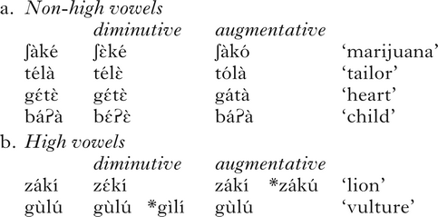 This paper investigates a pattern of root-vowel mutation in Fungwa (Kainji), an endangered language spoken in Nigeria (Akinbo Reference Akinbo2021). In the language, non-high vowels of nominal roots are fronted to mark the diminutive (e.g. smallness), as in (1a). To mark the augmentative (e.g. bigness), the non-high vowels of nominal roots are backed. When all the root vowels are non-high, the mutations result in root-internal vowel harmony. As shown in (1b), under the same condition as the non-high vowels, high vowels are invariant. Diminutive and augmentative are categories of evaluative morphology, which involves linguistic objects that express concepts such as quantity (e.g. small vs. big), quality (e.g. good vs. bad) and affection (e.g. neutral, positive or negative) (Déchaine et al. Reference Déchaine, Girard, Mudzingwa and Wiltschko2014). Prior to my original fieldwork on the language, this pattern of mutation had not been reported for Fungwa, nor, to a large extent, for other Kainji languages.