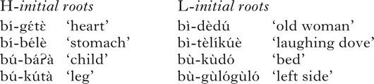 Fungwa has a process of tonal assimilation involving CV prefixes. As shown in (13), the prefix is [bí] or [bú] when the following TBU has an H tone but [bì] or [bù] when the following TBU has an L tone.