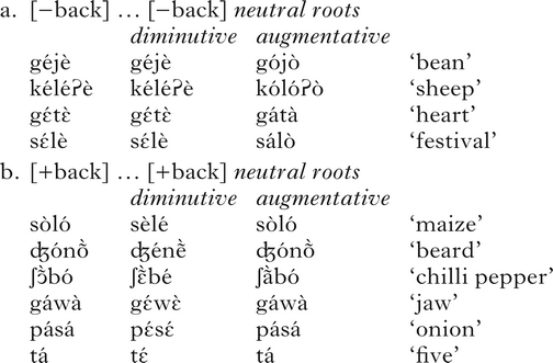 Marking diminutive or augmentative with the root-vowel mutation can be analysed as a kind of featural affixation (Akinlabi Reference Akinlabi1996). To distinguish featural affixation from phonological harmony, Finley (Reference Finley2009) classifies featural affixation which result in root-internal harmony like that in Fungwa as morphemic harmony. In this section, I address each of these generalisations, and present a formal account. I take the proposal in Finley (Reference Finley2009) as a point of departure.