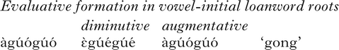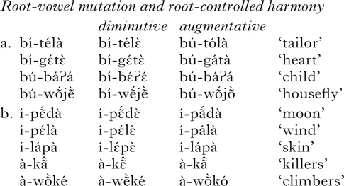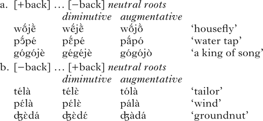 Following the account in Akinbo (Reference Akinbo2019), the domain of root-controlled harmony is a ω which is subject to an onset requirement. In this case, the vowel of the CV prefixes agreeing in backness with the feature value of the root-vowel mutation is determined by root-controlled harmony, not by evaluative formation (33a). The invariance of the V prefixes, despite the nominal root undergoing the root-vowel mutation, is consistent with this account (see §2.3).