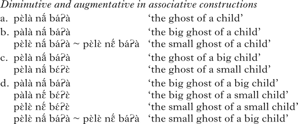 As shown in §3.1, the root vowels of a modified noun or the nominal modifier can independently undergo evaluative formation. In some cases, like mutation in complex nominal structures, not all the non-high vowels undergo root-vowel backing or fronting, as shown in (35). If we take into account that the domain of evaluative formation is a root morpheme, these examples might contain two root morphemes. An argument for this is that the form [béńdè] ‘that’ has a reduced variant [bé], as shown in (35).