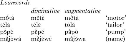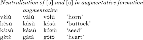 In diminutive formation in (14b), the root vowel [o] is realised as [e], and vice versa in augmentative formation in (a). The mutation of the vowels [ɔ a] overlaps in diminutive formation – they are both realised as [ɛ]. In augmentative formation, [ɛ] is realised as [a]. Surface ambiguity is created by the fact that a front vowel sequence can occur both in neutral and in diminutive forms (14a), while a back vowel sequence can occur both in neutral and in augmentative forms (14b).