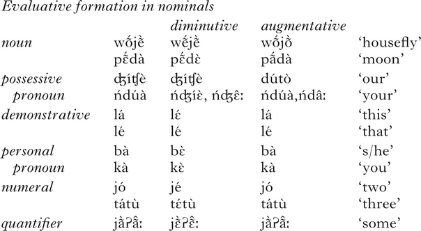 All the forms which undergo evaluative formation in Fungwa are nominals. It should be noted that the distal demonstrative [lé] in (19) does not undergo root-vowel backing. My consultants suggest that backing the distal demonstrative might ‘sound like child language’. The meaning of diminutive and augmentative formation in all these domains offers valuable insight into the semantics of evaluative morphology in Fungwa. Although the prototypical meanings of the augmentative and diminutive are big and small respectively, they also mark the distinction between significance and insignificance, good and bad, masculine and feminine, and old and young. For instance, my main consultant referred to the bandits who raided his village using the diminutive form of a pronoun because they were ‘bad’. A diminutive pronoun is also used when referring to a female. To use the diminutive instead of the augmentative form for a dignitary would be ‘disrespectful’, or suggest that the individual had an insignificant or bad status.