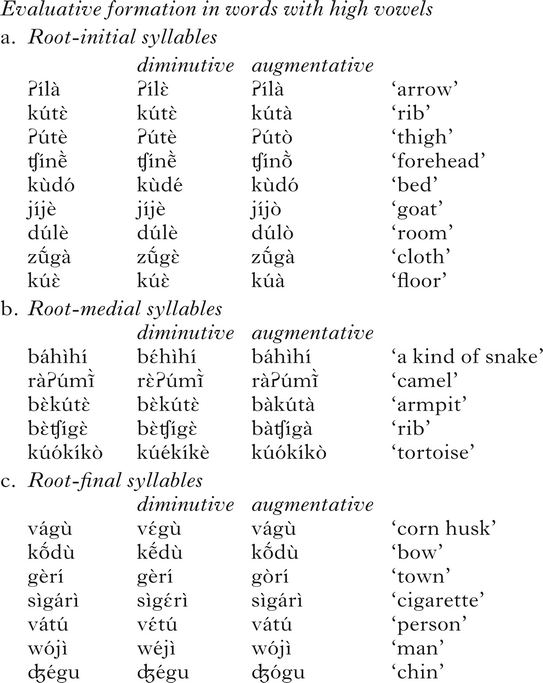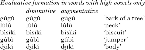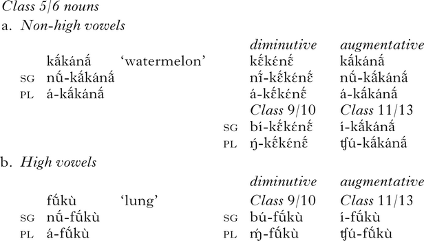 For example, when a noun undergoes diminutive formation and is morphologically marked for number, the nominal stem may either take its intrinsic class prefix or the prefix of Classes 9 and 10. When it undergoes augmentative formation and is morphological marked for number, the stem may either take its intrinsic class prefix or the prefix of Classes 11 and 13. This interaction between the evaluative morphemes and the noun-class prefixes occurs in all nominals, regardless of their vowels. Notably, this is the only phonetic cue for evaluative formation when a noun has only high vowels. According to Akinbo (Reference Akinbo2021: 194), this is ‘a result of the overlap between the semantics of evaluative morphemes and the characteristic features of nouns which belong to’ Classes 9/10 and 11/13 (see Akinbo Reference Akinbo2021: ch. 6 for further discussion). The interaction between noun-class prefixes and evaluative formation is not peculiar to Fungwa; it is also found in Bantu languages such as Swahili (Carstens Reference Carstens1991), Nata (Gambarage Reference Gambarage2019), Shona (Déchaine et al. Reference Déchaine, Girard, Mudzingwa and Wiltschko2014), Bemba and other languages (see Maho Reference Maho1999).