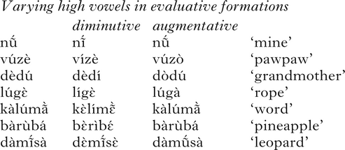 The distribution of the invariant high vowels is similar to that of the variable ones. For example, while the word-final high back vowel in [dèdú] ‘grandmother’ undergoes fronting in the diminutive formation [dèdí], the word-final high back vowel in [kṍdù] ‘bow’ does not undergo fronting in the diminutive formation [kẽ́dù]. Similarly, the word-final high front vowel in [mã̀lèmĩ́] ‘teacher’ undergoes backing in the augmentative form [mã̀lòmṹ], but the word-final high vowel in [kέnε̃̀rí] ‘canary’ does not undergo backing in the augmentative form [kànã̀rí]. There are about 15 forms with alternating high vowels in evaluative formations, but more than 600 forms with invariant high vowels were elicited.