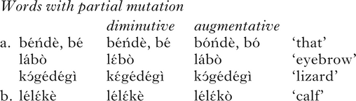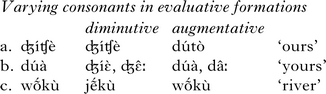In diminutive formation, the consonants [d] and [w] are realised as [ʤ] and [j] respectively, as in (23b, c). In augmentative formation, the consonants [ʤ] and [ʧ] are realised as [d] and [t] (23a). However, root-consonant mutation does not occur with other words with the same consonants (14)–(21). Given that the high vowel [i] does not trigger palatalisation (e.g. [í-díʃέmũ̀] ‘sneezing’ and [tìtí] ‘road’), the consonant mutation can be considered an effect of diminutive and augmentative formation, not the vowel [i]. There are only five examples with root-consonant mutation. Like forms with high vowel mutations, words with root-consonant mutations are considered exceptions.