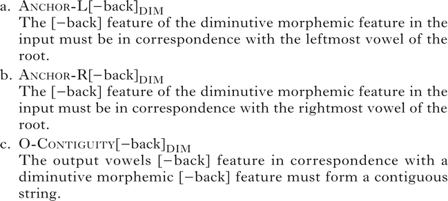 McCarthy & Prince's (Reference McCarthy, Prince, Beckman, Dickey and Urbanczyk1995) definition of correspondence constraints involves segmental elements, but they note that it could be extended to elements that are bigger or smaller than a segment. To account for featural affixation, which results in root-internal harmony, Finley (Reference Finley2009) proposes morpheme-specific correspondence constraints, which are feature-based versions of the original correspondence constraints in McCarthy & Prince (Reference McCarthy and Prince1993a, Reference McCarthy, Prince, Beckman, Dickey and Urbanczyk1995). Finley's constraints require correspondence between features and the edges of a relevant domain. These constraints are morpheme-specific versions of Edge-anchor and Contiguity. The diminutive morpheme formulations of the constraints are provided in (24).