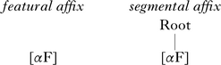 In the phonological literature, morphemic features are also referred to as featural affixes (Akinlabi Reference Akinlabi1996). Like segmental affixes, featural affixes attach to edges of specific morphological domains, and are often forced away from the edges of the domain like infixes. While a segmental affix contains a bundle of phonological features with a root node, a featural affix is a feature without a root node (Goldsmith Reference Goldsmith1976, Clements Reference Clements1985, Archangeli & Pulleyblank Reference Archangeli and Pulleyblank1994, Zoll Reference Zoll1996). Because a root node is essential to the realisation of a (floating) feature, the featural affixes are realised as part of a segment in the output. This realisation often results in a root-segment mutation. (25) shows the difference between a featural affix and a segmental affix.