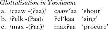 Zoll (Reference Zoll1996) makes a distinction between latent segments and dependent features. Latent segments can be realised on an epenthetic root node or as part of an existing root node, but dependent features are only realised on existing root nodes. Sonorant glottalisation, which accompanies durative formation in Yowlumne (Yokuts; U.S.A.) (26a, b), is an example of a latent segment because it can exist independently, as in (26c) (Archangeli Reference Archangeli1984, Archangeli & Pulleyblank Reference Archangeli and Pulleyblank1994, Zoll Reference Zoll1996).