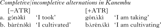 In Kanembu (Nilotic; Nigeria and Chad), the incompletive in (27), which is marked by the tongue-root advancement of all root vowels, is an example involving dependent features (Finley Reference Finley2009).