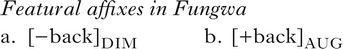 Diminutive and augmentative formation in Fungwa is similar to featural affixation in Kanembu. For diminutive formation in Fungwa, I assume a [―back] diminutive morphemic feature, as in (28a). Similarly, augmentative formation involves an augmentative morpheme, which has a [+back] feature as its phonological exponent, as in (28b).