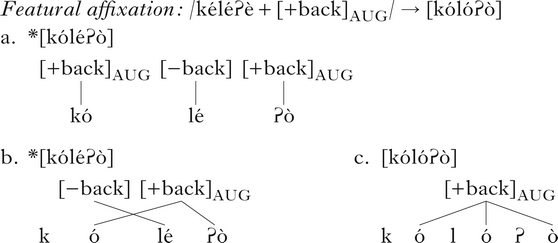 Similarly to the statement of convexity, Pulleyblank (Reference Pulleyblank1996) argues that a representation with line-crossing, such as the form in (29b), can also be rejected on the ground that it is not phonetically viable. For instance, as the [+back] feature of the augmentative morpheme continuously spans all the root morphemes in (29b), it is not phonetically plausible for the medial vowel to be [+back] and [―back] simultaneously. Thus the gapped representation is phonetically ill-formed.