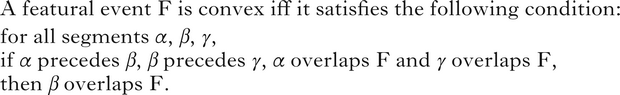 The configuration in (29b) satisfies Integrity[+back]AUG, but violates the No Crossing Condition (Goldsmith Reference Goldsmith1976). As argued in Archangeli & Pulleyblank (Reference Archangeli and Pulleyblank1994), the No Crossing Condition requires that all phonological relations be local, where locality is defined as respecting conditions on adjacency and precedence. Following this, Pulleyblank (Reference Pulleyblank1996) argues that representations such as (29b) have ‘contradictory precedence relations’. For example, in (29b), a direct tier-internal evaluation of precedence shows that [―back] precedes [+back]AUG, but an indirect cross-tier evaluation shows that [+back]AUG precedes [―back]. Thus (29b) is ill-formed (see Pulleyblank Reference Pulleyblank1996). Ní Chiosáin & Padgett (Reference Ní Chiosáin and Padgett1997, Reference Ní Chiosáin, Padgett and Lombardi2001) formulate adjacency and precedence as ‘convexity’, as in (31). Simply defined, convexity requires a feature F to be realised on a medial segment β if it is realised on flanking segments α and γ. According to Ní Chiosáin & Padgett (Reference Ní Chiosáin, Padgett and Lombardi2001: 127), convexity ‘holds of phonological representations without exception: in Optimality Theoretic terms, it constrains the candidate set that Gen produces’. In this case, Gen cannot produce a candidate like (29b).