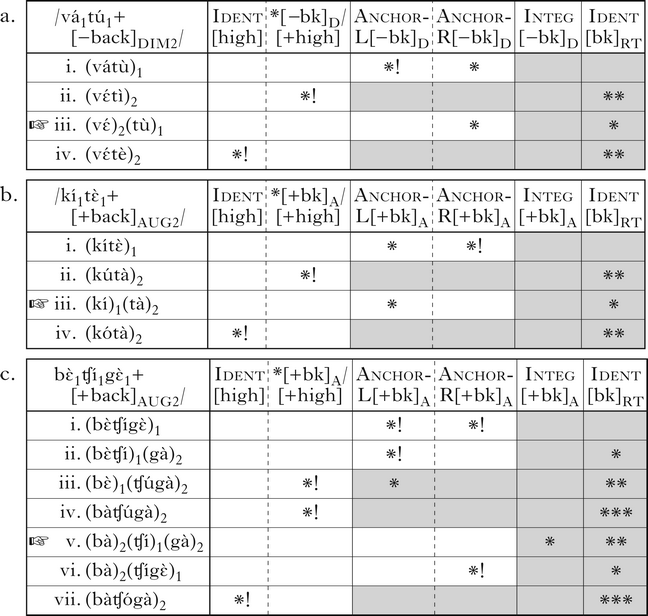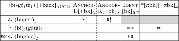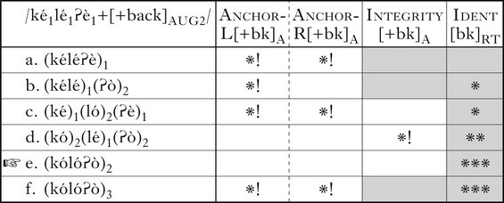 In Finley (Reference Finley2009), the mutation of a medial vowel in morphemic harmony is an effect of the constraint O-Contiguity[+back]AUG, which requires the augmentative morphemic feature to form a contiguous string in the output. Under the account here, i.e. that Gen does not generate a gapped representation, a twin-peak configuration like the form in (29b) will vacuously satisfy O-Contiguity[+back]AUG (see Pulleyblank Reference Pulleyblank1996). Thus the constraint does not play a crucial role in the present account. By replacing it with Integrity[+back]AUG, we are able to rule out a twin-peak configuration for a root morpheme with only non-high vowels. Integrity[+back]AUG is ranked below the anchoring constraints in this section; this ranking is motivated in §4.4.