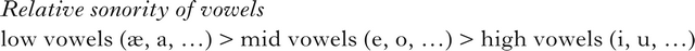 We have seen that, although high vowels do not undergo diminutive or augmentative formation in most cases, there are some which do. I assume that the small number which undergo the mutations are exceptions. The invariance of most high vowels can be accounted for with reference to sonority, i.e. the relative prominence of different sounds (Clements Reference Clements, Kingston and Beckman1990, Parker Reference Parker2002, Howe & Pulleyblank Reference Howe and Pulleyblank2004). It has been established that high vowels have low sonority relative to non-high vowels, as in (36) (Howe & Pulleyblank Reference Howe and Pulleyblank2004: 4). Phonetic studies on different languages show that this height-based sonority scale is phonetically grounded (e.g. Parker Reference Parker2002). The results of these phonetic studies suggest that height-based sonority directly corresponds to the duration, oral pressure and F1 of high and non-high vowels.