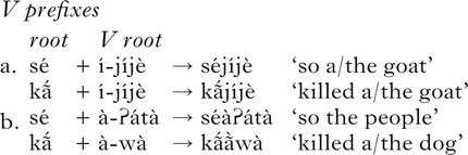 A language-internal argument for the low prominence of high vowels in Fungwa comes from the V prefixes in vowel hiatus contexts (38). Recall in this regard that only vowels [i a] occur as vowel-initial prefixes. A V prefix with [i] in a vowel hiatus context is elided, but a V prefix with [a] is not. Similar patterns of hiatus resolution are found in Yorùbá (Orie & Pulleyblank Reference Orie and Pulleyblank2002) and other languages (see Howe & Pulleyblank Reference Howe and Pulleyblank2004).