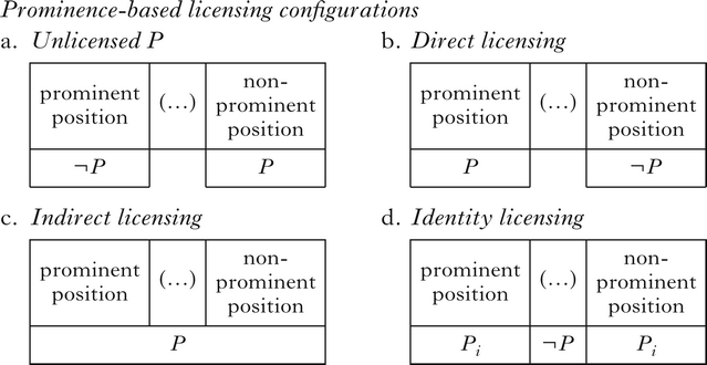 The top row in each case contains cells with prominent and non-prominent positions, while the bottom row contains cells that represent the presence or absence of a vocalic property P. If P appears immediately below the cell of a position, this signifies that the vocalic property P occurs in that position. The appearance of ¬P immediately below the cell of a position signifies that the vocalic property P does not occur in that position. For instance, prominence-based licensing disfavours the configuration in (39a), because P is not expressed in the prominent position. However, licensing favours the expression of P in the other configurations (39b–d). In direct licensing, (39b), P is only expressed in a prominent position, and is prevented from appearing elsewhere. In the case of indirect licensing, (39c), P spans both prominent and non-prominent positions, without interruption. In identity licensing, (39d), coindexed instances of P are present in prominent and non-prominent positions, and may be separated by an intervening element. Walker (Reference Walker2011) proposes licensing for vocalic properties, but this can be extended to morphemic features.