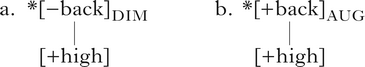 The fact that evaluative morphemic features are only realised on non-high vowels suggests prominence-based direct licensing. We can achieve direct licensing with a markedness constraint, such as the diminutive-specific constraint in (40a). The augmentative-specific instance of the constraint (40b) also prohibits the realisation of the augmentative feature on a high vowel.