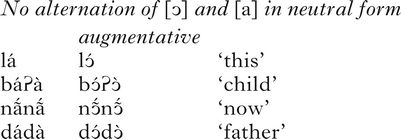 [ɔ] in neutral forms can optionally be realised as [a], but the opposite is not true. For example, a root morpheme with only back vowels may be interpreted as an augmentative form. However, when [a] in a nominal root with only back vowels is realised as [ɔ], the noun is always interpreted as an augmentative form, as in (44).