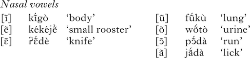 Fungwa is a tone language, like all Niger-Congo languages spoken in Nigeria, with the exception of Fulfulde (Williamson Reference Williamson1984, Elugbe & Omamor Reference Elugbe and Omamor1991). There are two tones in Fungwa, High and Low. Consider the minimal pairs in (12).