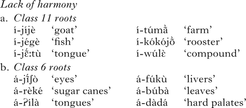 The Class 9 prefix is [bi-] when the vowel of the following root syllable is front, but [bu-] when the vowel of the following root syllable is back. However, the root-internal vowels can be disharmonic, as in (7c). In such cases, the prefix vowel agrees in backness with the first vowel of the root. Agreement in backness between the prefix vowel and the vowel of the following root syllable is a form of root-controlled harmony (Clements Reference Clements1981, Reference Clements1985).