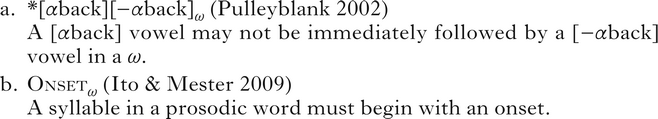 As argued in Akinbo (Reference Akinbo2019, Reference Akinbo2021), the domain of harmony, minimality and an onset condition in Fungwa is the prosodic word (ω). Following Pulleyblank (Reference Pulleyblank2002), the condition on vowel harmony can be formalised as the no-disagreement constraint *[αback][―αback]ω in (9a), which requires vowels in a ω to have the same value for the feature [back]. Following Ito & Mester (Reference Ito, Mester and Parker2009), Akinbo (Reference Akinbo2021) formalises the onset condition as the constraint Onsetω, which assigns a violation to a vowel-initial syllable (9b). The minimality requirement is not crucial to the discussion here.
