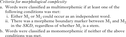 Each word in the database was encoded for the occurrence or absence of n-insertion, based on the pronunciation given in the SKD. Morphological complexity was additionally encoded on the basis of the criteria in (10).