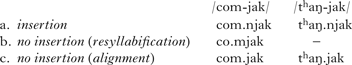 When /n/ is not inserted, M1-final C1 consonants can be either resyllabified into the onset of the M2-initial syllable or aligned with the end of the M1-final syllable, as shown in (13).