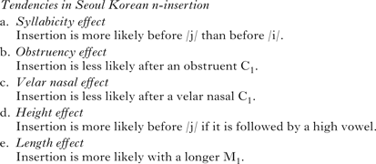 In this paper, I have explored variation in Seoul Korean n-insertion, with the following two aims: (i) to find out whether speakers learn the tendencies which can be observed in existing words in their native language, and (ii) to develop a formal account of Korean n-insertion. I first discussed a number of tendencies in the distribution of n-insertion in existing Seoul Korean words, on the basis of data from my own survey, the SKD and previous studies. These tendencies can be summarised as follows: (i) n-insertion is more likely before a glide than before a vowel; (ii) n-insertion is less likely after obstruents than after sonorants, except /ŋ/; (iii) n-insertion is less likely after /ŋ/ than after other sonorants; (iv) n-insertion is more likely when /j/ precedes a high vowel; (v) n-insertion is more likely when the morpheme preceding the insertion site is longer.