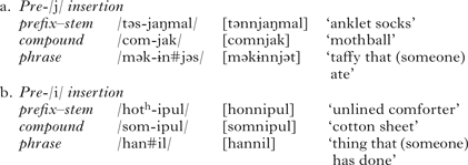 On the other hand, certain /j/-initial M2 suffixes may trigger n-insertion (Ko Reference Ko1992: 37, Kim et al. Reference Kim, Park, Ahn and Lee2002).