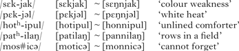 Second, when C1 is an obstruent, n-insertion is accompanied by the nasalisation of C1, as in /hεk-jəlljo/ [hεŋnjəlljo]. One might think that this nasalisation would create a rather large perceptual departure from the input. However, it seems that the nasalisation of C1 has only a minor role in the P-map's effect. This is understandable, given that final position in a word or morpheme is acoustically less salient and less important in speech processing than the corresponding initial position, and thus changes there would be perceptually less salient (Casali Reference Casali1997). Accordingly, the nasalisation of C1 at the end of M1 does not have a large perceptual effect on the input.Footnote 28 Consequently, the proposed P-map account can be maintained, regardless of C1 type.