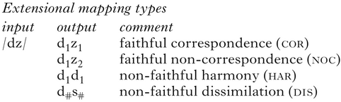 There are four general types of optimal mappings that occur in simple ABC(D) systems. One, the original goal of the theory, is segmental agreement, called ‘harmony’. In this type, abbreviated as har, some input segment(s) are unfaithfully mapped so that corresponding segments in the output forms agree in some feature(s). The complement, dissimilation (dis), occurs when unfaithful mappings result in feature disagreement. The other two types are faithful mappings, where input segment features are matched in the output. These differ in whether the output segments correspond (cor) or not (noc), with repercussions for their constraint violations. Note that the overt forms of these two types are indistinguishable, as correspondence indices are hidden structure; the segmental feature mappings in both types are equivalent.