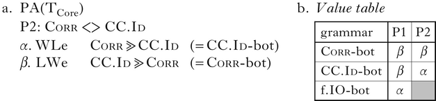 P1 does not distinguish between the two grammars Corr-bot and CC.Id-bot. These both share the characteristic of having the IO-faithfulness constraint ranked above one or the other of the correspondence constraints, so they share the extensional trait of having only segmentally faithful mappings. Segmentally faithful candidates differ in which correspondence constraint they violate on the basis of their correspondence indices: disagreeing segments can either correspond (violating CC.Id) or not (violating Corr). The CC.Id-bot language chooses the former; the Corr-bot language chooses the latter. These grammars are characterised by P1.β, which generates a disjunction of two ERCs; in these grammars, either f.IO ⪢ Corr or f.IO ⪢ CC.Id. Determining which requires an ERC ranking Corr and CC.Id relative to each other, not just relative to f.IO – a second property. P2 orders Corr and CC.Id; this intensional choice correlates the extensional trait of the existence of correspondence between segments in optima, as in (10a). CC.Id-bot has the value P2.α, while Corr-bot has P2.β. These values, together with the P1.β value shared by both grammars, yield the ERC sets that fully define each grammar.