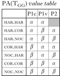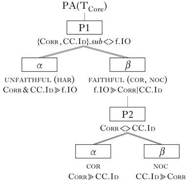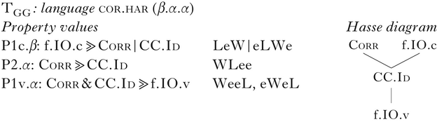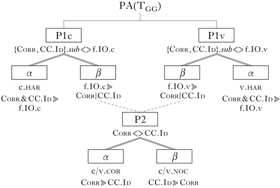The PA of TGG is different from that of TCore in (11), in that the top level of the treeoid splits. The consequence is that the choice between faithful mappings and harmony is made separately for each feature. If f.IO.c is dominated by both Corr and CC.Id, it does not entail that f.IO.v is too. By contrast, P2 remains unsplit, and is in the scope of both P1v and P1c. This is why the typology has no grammars that combine both cor and noc mappings. The extensional choice of noc or cor depends on the ranking between Corr and CC.Id, and only a single ranking of the two is possible in any one grammar. Consequently, the choice of correspondence cuts across both featural subsystems. Grammars with the value P2.α (Corr ⪢ CC.Id) have correspondence in all faithful optima; those with P2.β (CC.Id ⪢ Corr) have systematic non-correspondence. The value table in (19) shows the possible value combinations that delineate the grammars. Only the grammar for har.har falls outside the scope of P2; in this grammar, both Corr and CC.Id dominate both f.IO constraints, and all non-agreeing inputs harmonise.