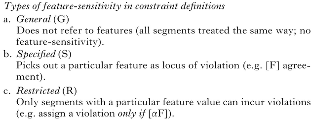 General constraints are feature-blind, as in TCore’s unified versions of Corr and CC.Id. Feature-specified constraints assess violations for specific features: the CC.Id.F constraints that require agreement for F. Feature-restricted constraints assign violations only to segments that share a particular feature-value specification, and also fail some other condition. These are constraints like Rose & Walker's (2004) Corr.αF, which require correspondence between two consonants only if both are [αF]. The specific vs. restricted distinction is highly significant: as we show, the presence of feature-restricted constraints in a system is what gives rise to dissimilation.