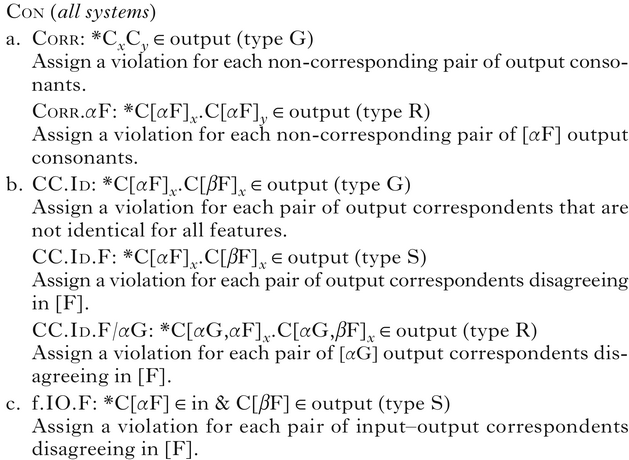 All variations employ the same fundamental types of constraints to explain correspondence and consonant harmony, Corr and CC.Id,Footnote 5 described informally in (4).