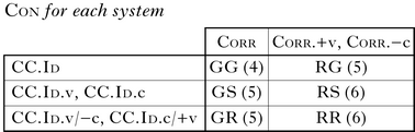 The systems examined here are distinct combinations of varying the kinds of Corr and CC.Id constraints used, in how they relate to features. We recognise the three distinct ways in (12) in which previously proposed constraints may be sensitive to features.