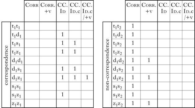 Similarly, general CC.Id assigns violations to pairs of correspondents that differ in any feature. Feature-specific CC.Id.c assigns violations only to the subset of those that differ specifically in the feature [±continuant]: it penalises [t1z1] and [d1s1], but not [t1d1] or [s1z1] (which share the same [continuant] value but differ in [voice]). Finally, the violations of feature-restricted CC.Id.c/+v are a subset of those assigned by CC.Id.c: it penalises only correspondents that disagree on [continuant] and share [+voice]. Thus [d1z1] receives a violation, but [t1z1] does not; the constraint is vacuously satisfied whenever two correspondents fail to meet the similarity threshold required.