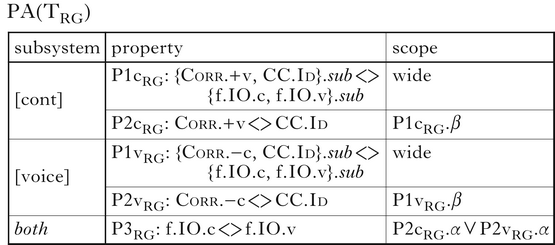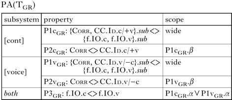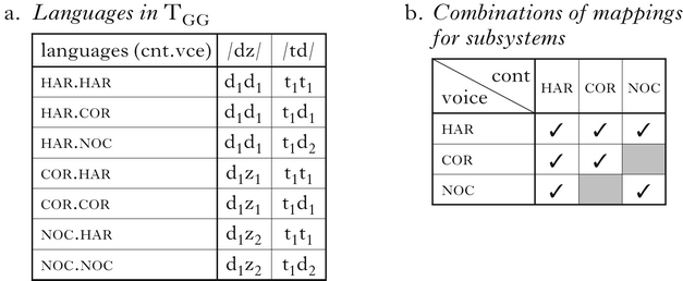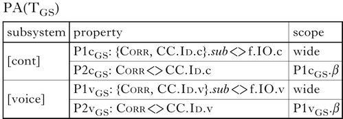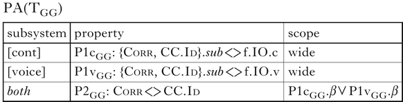 Exactly as in PA(TCore), the grammars are determined by a bot ranking structure between Corr, CC.Id and f.IO. This system differs, however, in that this structure exists with each f.IO constraint. Thus f.IO.c may be dominant (faithfulness when segments disagree in [continuant]; /dz/), while f.IO.v is dominated by both Corr and CC.Id (harmony for segments disagreeing in [voice]; /td/). Each f.IO constraint defines a subsystem of the full PA. A subsystem is a subset of the properties – involving the interaction of a subset of the constraints – that determines the optima for a subset of inputs. This formalises the fact that only some of the constraints determine the choice of a given mapping. In GG, the subsystem that includes f.IO.c determines the treatment of inputs with segments differing only in [continuant]; that with f.IO.v determines the mapping where input segments differ in [voice]. In Core there is a single property for the ranking between the class of correspondence constraints and faithfulness, resulting in a single extensional choice of faithfulness or harmony. TGG splits this into two properties, one for each of the feature-specific faithfulness constraints, allowing for distinct mappings depending on segmental features.