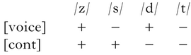 To analyse the effects of distinct variations of Con, we hold Gen constant, providing a fixed frame of reference within which we can rigorously and exhaustively examine the typologies. In defining Gen, we aim to have the minimum space of possibilities needed to show the basic mode of interaction of each theory. More specifically, the target interaction is (potential) similarity-based consonant harmony: ‘if two consonants share one feature, then they agree for another feature’. We therefore consider only two-consonant strings, and two features, [±voice] and [±continuant], yielding the segmental inventory shown in (2).Footnote 3 These two features are used both for their simplicity and familiarity, and because they link the typological questions of this paper to a real-world point of contact in the form of Yabem, a language where voicing and stricture harmony co-occur (Hansson Reference Hansson2004, Reference Hansson2010, Hansson & Entwistle Reference Hansson, Entwistle and Luo2013).