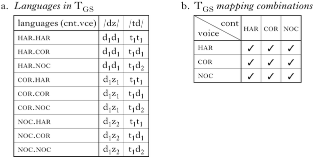 Intensionally, the structures familiar from TCore and TGG recur in TGS. All grammars are defined by two bot-ranking structures, one for each feature. As in TGG, the choice of faithfulness for one feature is separated from faithfulness for the other; the two subsystems involve different faithfulness constraints. Unlike TGG, the subsystems in PA(TGS) also involve different CC.Id constraints. This decouples the ranking of Corr and CC.Id across the subsystems. One featural subsystem can have Corr ⪢ CC.Id.F, while the other has CC.Id.G ⪢ Corr, since these rankings involve different CC.Id constraints. The result is the free combination of types, rather than the dependency between cor and noc found in TGG.