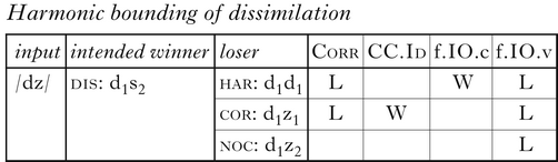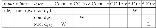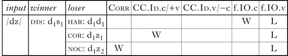 Dissimilation is possible in TGR because of the feature-restricted CC.Id.F/αG constraints. These are satisfied both by candidates in which corresponding segments agree on [F], and those in which they disagree on G. This is shown in (25), for input /dz/ undergoing [+voice] dissimilation to [t1z1] (or, equivalently, to [d1s1]; co-optima are omitted here). The dis candidate [d1s1] satisfies Corr: the two segments correspond. It also satisfies CC.Id.c/+v and CC.Id.v/−c, albeit in a less intuitive way. The only [+voice] segment is [d], and [d] does not disagree with itself for [continuant]; the only [−continuant] segment is also [d], again not an instance of [voice] disagreement. The dis candidate does have a f.IO.v violation not shared by cor or noc, but these alternatives violate either Corr or a CC.Id constraint. If the feature value picked out by [αG] in CC.Id.F/αG is eliminated, two segments can correspond (satisfying general Corr) without incurring disagreement violations. The choice of harmony or dissimilation among correspondents falls to the faithfulness constraints.