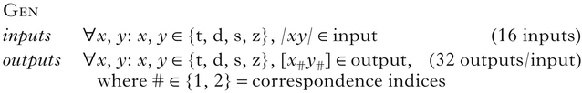 As inputs, we admit all possible strings of any two consonants. Outputs consist of the same set of possible strings, with or without correspondence between the segments (the only two surface correspondence structures possible for two segments). Gen is defined in (3).