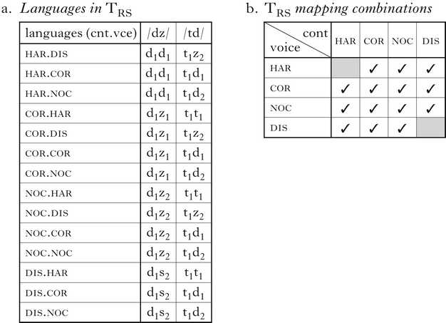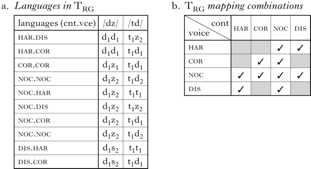 The ten languages of TGR are shown in (26a). All languages are combinations of the one of the four types of possible mappings {dis, har, cor, noc} for each featural subsystem; these are shown in the grid in (26b). Not all logical combinations of mappings are possible grammars: har and dis are incompatible with noc. Additionally, har.har and dis.dis languages are impossible. If a language has harmony for one feature, it can only have dis or cor for the other.