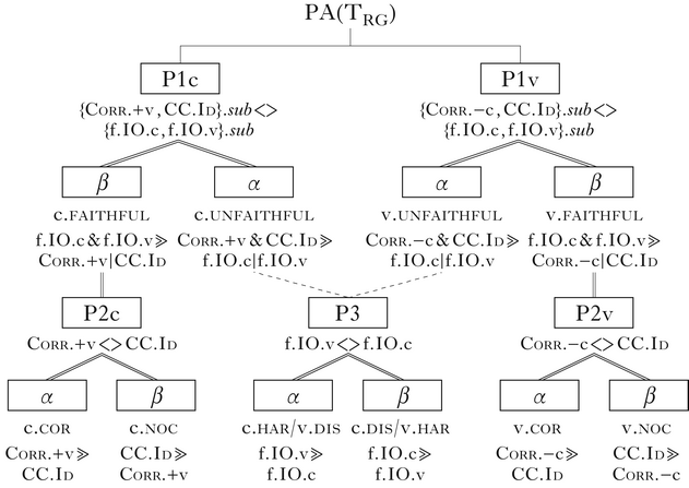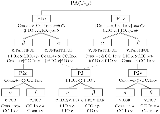 The difference in the size of the typology arises from the degree of overlap between the antagonist sets of the two constraint subsystems. In TGR and TRG, feature-general unified constraints Corr and CC.Id interact in both subsystems, so ranking conditions in each restrict those in the other. In TRS, each Corr and CC.Id constraint is in one subsystem. Thus one can have a Corr constraint as its bot, and the other a CC.Id constraint; there is no ranking contradiction, since different Corr and CC.Id constraints are involved in each ranking. The only shared constraints are f.IO constraints. As before, their ranking (P3) is the choice between har and dis – a choice only made in the case of an unfaithful mapping (P1c.α or P1v.α). Thus the isomorphism between the treeoids of PA(TGR) and PA(TRG) also obtains here, as shown in (35).