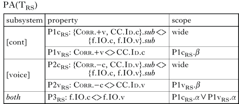 Its treeoid, in (24), is exactly two copies of that of PA(TCore). P1c and P1v closely resemble the P1s in TGG, but differ in that the class of constraints opposing faithfulness in each property puts Corr together with different CC.Id constraints: CC.Id.c in the first and CC.Id.v in the second. P2 of TGG is replaced by two properties, P2c and P2v, a split analogous to the split of P1 made in TGG. Values of these two properties correlate with the extensional choice of correspondence in faithful forms; they are narrow-scope choices that depend on the value of the two P1s. Unlike TGG, a choice about correspondence in one featural subsystem does not dictate the choice in the other. Grammars can choose faithful correspondence for /td/ (which disagree in [voice]), and also non-correspondence for /dz/ (which disagree in [continuant]), and vice versa. The properties group together into the subsystems {P1c, P2c} and {P1v, P2v}, which make the familiar set of grammatical classifications, but independently for each feature.