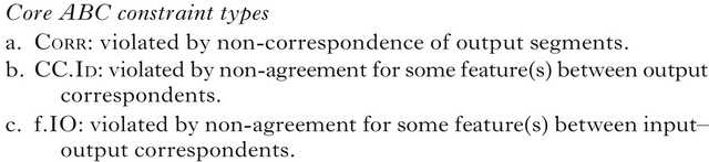 ABC analyses quintessentially posit two general constraint types referring to correspondence relationships between segments in an output string. Corr constraints are violated by non-correspondence; they demand correspondence between segments – typically based on similarity. CC.Ident (CC.Id) constraints are violated by disagreement between correspondents; they demand feature agreement contingent on correspondence. Corr and CC.Id constraints together drive harmony: both are satisfied when two segments correspond and agree. This interaction is the intuitive basis of agreement by correspondence, but the two constraint types can have other consequences as well; for instance, Corr and CC.Id are satisfied equally well by dissimilation (Bennett Reference Bennett2015).