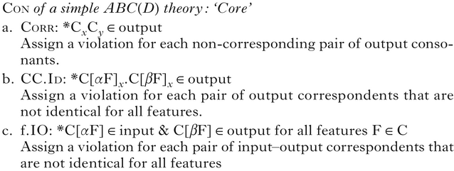 A central insight of ABC theory is that harmony is conditioned by segmental similarity, with more similar segments more likely to harmonise. The original work in this theory proposed families of Corr.αF and CC.Id.F constraints, often specified for particular features ([F]) or feature values (αF). These regulate correspondence between segments or require agreement between correspondents for a single feature (rather than all features). Constraint sets of this type are proposed by Walker (Reference Walker2000a, Reference Walkerb, 2010), Rose & Walker (Reference Rose and Walker2004), Hansson (Reference Hansson2010) and Bennett (Reference Bennett2015), among others.