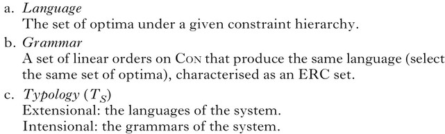 The core objects of analysis are defined in (6). Following work in formal OT (Prince Reference Prince2016a, Reference Princeb, Merchant & Prince Reference Merchant and Princeto appear), grammars are distinguished from languages. The former is a set of intensional rankings, characterised by an ERC set; the latter is the set of extensional forms that are optimal under these rankings. Typological analysis proceeds both extensionally, through the list of languages generated, and intensionally, through the rankings giving rise to those languages. The property analysis of a typology, PA(T), finds the grammatical choices that define the system. By delineating the distinguishing rankings that determine the grammars of the typology and aligning these with the extensional linguistic structures, a PA leads to an understanding of how the constraints interact to produce the predicted languages in the typologies.